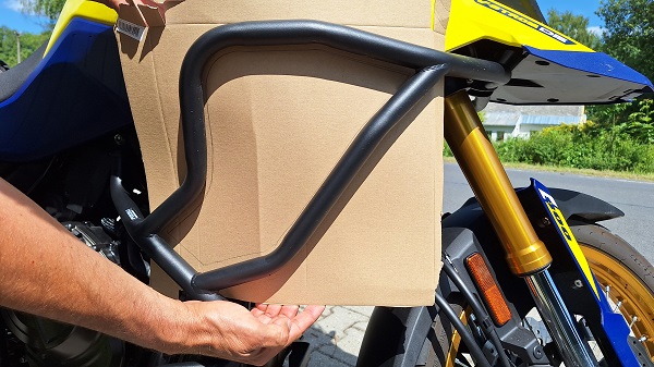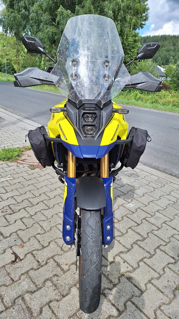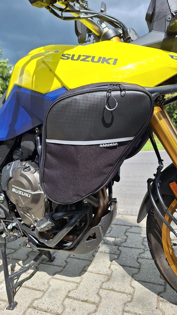 Brašny perfektně pasující na originál padací rám od Suzuki – pevně drží a hlavně dostatečně velký úložný prostor na pršipláště a plno jiných důležitých věcí .